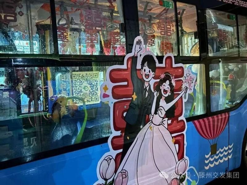 走進公交“寶寶巴士”,喜慶與萌趣更是撲面而來。車內(nèi),嬌艷的鮮花簇擁在座椅旁,粉紅與大紅交織出溫柔的儀式感;“囍”字拉花纏繞著車頂與吊環(huán),隨風輕晃間增添了幾分靈動;哆啦A夢等可愛毛絨玩偶乖乖“坐”在座位上,圓滾滾的模樣仿佛正為新人歡呼。車外,新人專屬的卡通造型貼于車身兩側(cè),畫中兩人笑容燦爛、手牽著手,滿是幸福模樣。這份萌趣外觀與喜慶氛圍的完美融合,引得路過市民紛紛駐足,舉起手機定格這份獨一無二的浪漫。