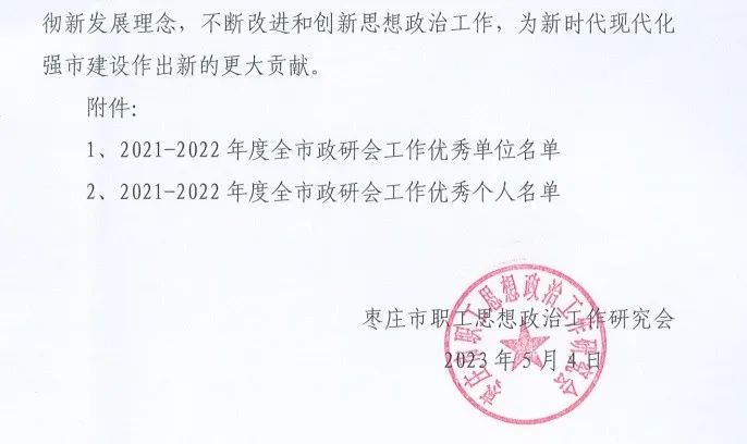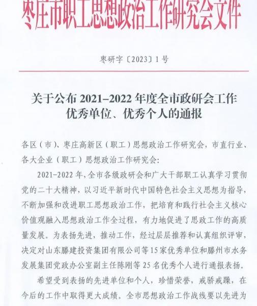近日,棗莊市職工思想政治工作研究會下發(fā)了《關(guān)于公布2021-2022年度全市政研會工作優(yōu)秀單位、優(yōu)秀個(gè)人的通報(bào)》(棗研字〔2023〕1號 ),集團(tuán)黨委委員、副總經(jīng)理、工會主席李丹同志榮獲棗莊市政研會工作優(yōu)秀個(gè)人。