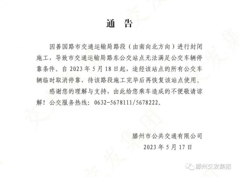關(guān)于臨時(shí)取消停靠市交通運(yùn)輸局東公交站臺的通告