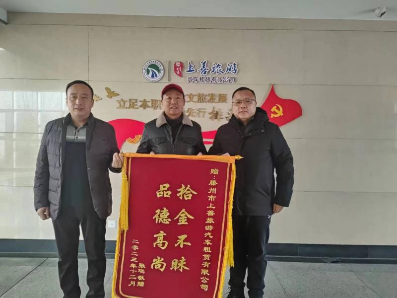 12月20日上午,市民張先生將一面印有“拾金不昧 品德高尚”的錦旗送到交發(fā)集團(tuán)上善旅游汽車租賃有限公司,對公司駕駛員和工作人員表示感謝。