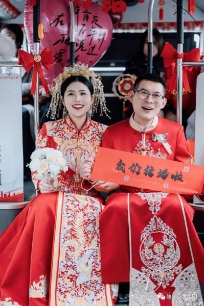 車(chē)頂燈顯示著帶有新人名字的專(zhuān)屬婚車(chē)字樣,車(chē)窗貼著囍字,內(nèi)飾五彩繽紛、大紅的喜字和氣球等掛件懸掛在整個(gè)車(chē)廂,橫幅“我們結(jié)婚啦”占據(jù)車(chē)廂的“C位”, 經(jīng)過(guò)一番裝扮,迎親公交散發(fā)出喜慶氛圍。象征美好愛(ài)情的公交婚車(chē),行駛在市內(nèi)的街道上,儼然一道亮麗的風(fēng)景。
