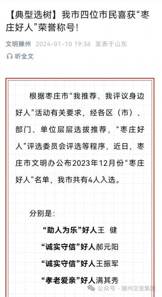 近日,棗莊市文明辦公布了2023年12月份“棗莊好人”名單,滕州市共有4人入選,其中,交發(fā)集團道服公司郝元陽喜獲“誠實守信”好人榮譽稱號。