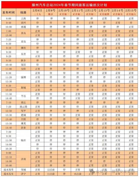 滕州—大計河:發(fā)車時間6:40—16:20,2月9號(除夕)、2月10號(初一)停運,2月11日(初二)恢復正常。