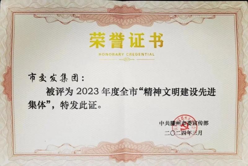 近日,中共滕州市委宣傳部下發(fā)了關(guān)于表揚(yáng)2023年度宣傳網(wǎng)信工作先進(jìn)集體和先進(jìn)個(gè)人的通報(bào),滕州市交通發(fā)展集團(tuán)榮獲2023年度全市“精神文明建設(shè)先進(jìn)集體”榮譽(yù)稱號(hào)。