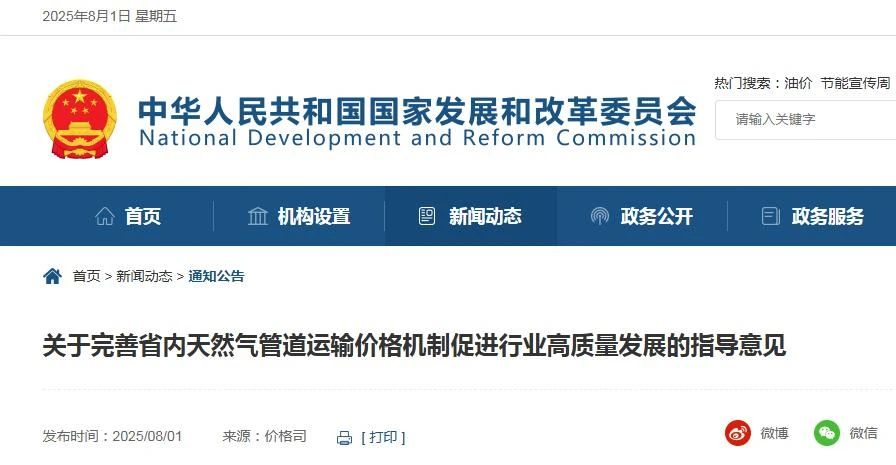 國家發(fā)改委、國家能源局發(fā)布《關(guān)于完善省內(nèi)天然氣管道運輸價格機制促進行業(yè)高質(zhì)量發(fā)展的指導意見》